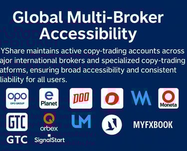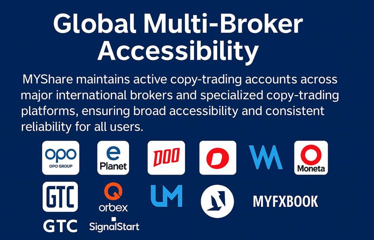 MYShare operates active copy-trading accounts across major international brokers — including Opo Finance, E-Planet, Do Market, Moneta Markets, XChef, CapitalXtend, Orbex Forex, WMM Markets, and GTC — plus dedicated positions on leading copy-trading and analytics platforms such as MyFXBook, Traia.app, SignalStart, TradeBench, and TraderOven. This broad infrastructure ensures maximum accessibility, flexibility, and long-term reliability for every user.