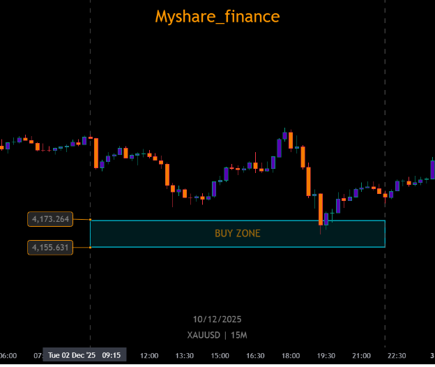 XAUUSD entered MyShare’s buy zone at 4,155 – 4,173 and showed a clean bullish reaction. Price respected the entire zone structure and produced an immediate reversal signal on the 15M timeframe, confirming it as a valid intraday demand zone.The zone held with strength and delivered a precise technical reaction.