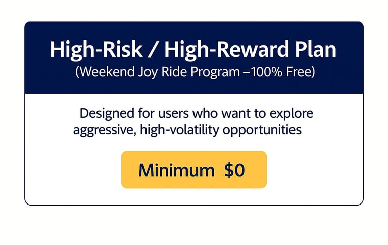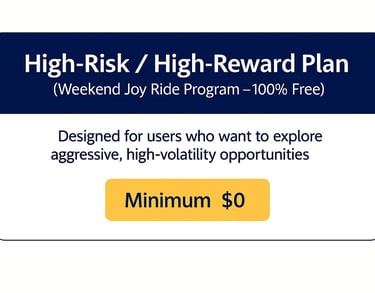 he Weekend Joy Ride Program is designed for users who want to explore high-volatility market behavior in a simple, optional, and fully educational format.Each weekend, one speculative setup is shared to help users observe how fast-moving markets react during intense price swings.This plan is not a recommendation or a trading signal.It’s an educational experience meant for users who are curious about how high-risk conditions work in real time.Participation is completely optional, and users always remain fully responsible for their own decisions. Includes: